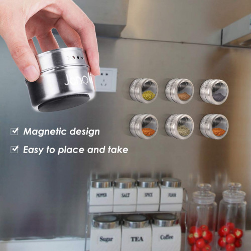 Das Set besteht aus 12 Gewürzgläsern. Diese sind aus Aluminium gefertigt und haben eine durchsichtige aus Plastik gefertigte Oberseite. Auf der Unterseite ist eine magnetische Fläche. Damit können die Dosen zum Beispiel am Kühlschrank befestigt werden und nehmen keinen Platz im Küchenschrank weg. Sollten die Behälter doch einmal herunterfallen, so ist das kein Problem, da sie nur 55g leicht, bruchsicher und sicher verschraubt sind. Zur richtigen Dosierung des Gewürzpulvers sind an der der Seite vier kleinen Löcher und ein größerer Schlitz. Selbstverständlich eignen sich die Dosen auch zum Aufbewahren von anderen Dingen und findet sicherlich auch im Hobby-Bereich gute Verwendung. Muss der Inhalt vor Licht geschützt werden, so kann der Deckel ja auch blickdicht zugeklebt werden. Im Lieferumfang sind bereits viele Aufkleber enthalten, diese sind aber eher für die Beschriftung der Gewürzgläser gedacht.